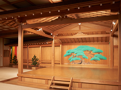 舞台の背景の鏡板には、松の老木が描かれています。奈良の春日大社の一之鳥居をくぐった右側に「影向(ようごう)の松」というご神木があり、ここに神様が降り立たれて芸能をご覧になったという伝説から、この松を舞台に移すことによって、われわれはいつも神様に見守られて演じているという意味が込められています。